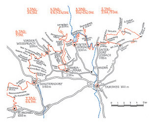 2. Tag: Transfer zum Prebersee, Gasthaus Ludlalm, 1500 m, Wanderung Richtung über Laraalm – Wagenberg, 1440 m und auf dem Güterweg nach Lessach, 1198 m. Nächtigung. Gehzeit 2 Stunden; 100 Hm Aufstieg, 400 Hm Abstieg. Variante: Transfer zur Abzweigung zur Grazer Hütte an der Preberstraße, 2 km nach dem Prebersee, 1500 m. Auf dem Grazer Steig zur Grazer Hütte, 3. Tag: Von Lessach Richtung Jausenstation Wildbachhütte, 1806 m. Ein ebener Weg führt zu den Granglitzalmen. Abstieg auf einer Forststraße nach Hintergöriach, 1230 m. Nächtigung. Gehzeit 3 1/2 Stunden; 650 Hm Aufstieg, 600 Hm Abstieg. Variante: Von der Wildbachhütte auf den Gumma(berg), 2315 m. Gehzeit hin und zurück 2 1/2 Stunden; jeweils 510 Hm Aufstieg und Abstieg. 4. Tag: Von Hintergöriach, 1230 m, über das Moargut, den Moarbergsteig G 6), den Gensgitschforstweg 5. Tag: Von Mariapfarr, 1119 m, über Niederrain nach Zankwarn, 1165 m. Am Lignitzbach durch den