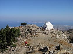 Die oben erwähnte Treppenanlage benutzen wir zum Anstieg. Unter einem schattigen Blätterdach geht es nach oben, wo wir dann auf ein Lehmsträßchen stoßen, welchem wir nach rechts folgen. Vorbei an der Taverne Kefalovrysi erkennt man bald auf der rechten Seite die kleine Kapelle mit der ehemaligen Quelle Kefalovrysi. Wir bleiben auf dem Lehmsträßchen und wandern bei dem Wegdreieck hinter der Kapelle nach rechts. Nach weiteren 100m kommt bei einem Bauernhof noch ein Wegdreieck. Hier jetzt geradeaus und bergauf, über die hier teils betonierte Straße und nun immer dieser Straße in einigen Windungen und Schleifen folgen. Man passiert auf der staubigen, aber kaum befahrenen, Straße mehrere, teils verfallene Bauernhäuschen und genießt schon hier oft einige schöne Aussichten auf die Nachbarinseln Kalymnos und Pserimos. Immer wieder bieten Bäume Schatten. Das Sträßchen führt immer leicht bergan bis man in einem lichten Wäldchen auf der linken Seite den Abzweig (Steinmann, roter Pfeil auf Stein, rotes Blechschild mit weißem Kreuz) zum eigentlichen Gipfelweg erreicht. (ca. 40 Minuten ab Parkplatz) . Jetzt geht es merklich steiler auf schmalem Felspfad im lichten Wald bergauf. Hin- und wieder weist ein Steinmann den Weg. Wenn auch der Weg kaum ausgezeichnet ist (einige blasse, blaue Farbkleckse sind hin und wieder zu erkennen), so kann man mit ein wenig Orientierungssinn den Weg kaum verfehlen. Nach 30 Minuten Anstieg (ab Abzweig Sandsträßchen) verlässt man mit herrlichen Ausblicken die Waldgrenze und ist dann froh, wenn man einen frühen Aufbruch gewählt hat. Denn jetzt ist man der Sonne völlig ausgesetzt. Man gewinnt über einige Felsen ohne Schwierigkeiten eine weitere Geländestufe und erreicht dann nach weiteren 10 Minuten eine jochähnliche Anhöhe, die zum ersten Mal einen Blick auf das blauglitzernde Meer der Südküste freigibt. Hier führt der Pfad in nur noch mäßiger Steigung nach links (südöstlich) und hält sich immer auf der Nordseite des Kamms. In weiteren 10 Minuten erreicht man ein weiteres Joch, wo schließlich der Blick auf den restlichen Anstieg und den Gipfel mit Kapelle frei wird. Erfahrene Bergwanderer könnten auch den erkennbaren Blockgrat, recht unschwierig zum Gipfel wählen (anstrengend). Empfehlenswert ist jedoch der deutlich sichtbare Pfad, der im nordseitigen Berghang den Gipfel gewinnt. Oben wird die Aufstiegsmühe mit einem grandiosen Blick belohnt. Schatten bieten einige Pinien. Unterschlupf bietet eine Holzhütte bei Wetterstürzen, die man auch als Notlager benutzen könnte. Abstieg wie Aufstieg. Übrigens: die lauschig im Grünen gelegene Taverne Kefalovrysi bietet sich zur Einkehr an. Gute griechische Hausmannskost und nicht so überlaufen wie die Tavernen im Ort! |