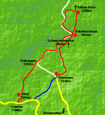 Zurück geht es über den Weg Nr. 1, rote Markierung, bis zum Weiler Pemmern (1538m). (Dort befindet sich die Talstation der Rittner Kabinenbahn, mit der man zur Schwarzseespitze gelangen kann.)