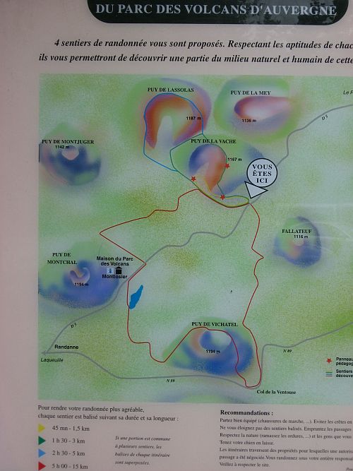 Vier Touren unterschiedlicher Länge sind markiert. Je nach Tour bewegen sich die Gehzeiten zwischen einer knappen Stunde und bis 5 Stunden. Tour gelb: Von Montlosier mit dem Auto noch etwas die Strasse weiter fahren, bis man auf der linken Seite einen Parkplatz findet. Kleine Rundwanderung Richtung Puy de la Vache: Gehzeit ca. 45 Min / Länge 1,5 km