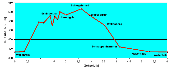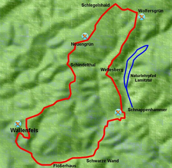 Startpunkt: Ausgangspunkt dieser Rundtour ist der Wanderparkplatz Flößerhaus in Wallenfels Strecke: Wallenfels-Schindelthal-Neuengrün-Wolfersgrün-Wellesberg-Schnappenhammer-Wallenfels Markierung: Nr 6 / blau auf weißem Grund a) Von Wallenfels nach Neuengrün 7,5 km