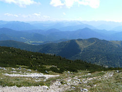 ![]() Benediktenwand mit Tutzinger Hütte Vom Bahnhof auf einer der beiden Straßen zur Ortsmitte gehen, dort rechts halten, bzw. die Straße zum Waldschwimmbad einschlagen. Am Schwimmbad links auf einem Forstweg vorbei gehen und jetzt mäßig ansteigend den Berg aufsteigen. An einem Aussichtpunkt links abdrehen, kurz durch Wald und Wiese bis zu einer Wegegabelung wandern. An der Gabelung rechts halten und den Forstweg weiter aufsteigen bis links ein Schild den Weg zum Gipfel weist. Diesen Pfad einschlagen und steiler durch Wald bis zu einer Zwischenhöhe aufsteigen. Zwischenzeitlich wird der Forstweg einige Male überquert. Ab der Zwischenhöhe den Forstweg bis zu einer Alm etwas absteigen. Kurz vor der Alm biegt nach links ein weiterer Forstweg ab. Diesen Weg einschlagen und in Kurven Richtung Glaswandscharte weiter aufsteigen. Kurz vor Ende des Forstweges rechts in einen Bergpfad abbiegen. Diesen Bergpfad folgen. Zunächst wird nur wenig an Höhe gewonnen später ergeben sich einige mäßige Steigungen. Der Weg ist bei Nässe etwas unangenehm zu gehen. An einer unbeschilderten Wegegabelung rechts weiter gehen. Schließlich wird die Glaswandscharte erreicht. An der dortigen Wegekreuzung links abbiegen und steil die Westseite der Benediktenwand aufsteigen. Nach 20-30 Minuten ergeben sich gute Fernblicke Richtung Süden und Westen. Kurz darauf trifft man auf den Weg von der Tutzinger Hütte zum Gipfel. Dort rechts abbiegen und weiter steil/mäßig steil zum Gipfel aufsteigen. Durch Latschenkiefergewächse erreicht man nach ca. 30 weiteren Minuten den Gipfel. Es ergeben sich weitere Fernblicke in alle Richtungen. Der Abstieg erfolgt zunächst auf gleichem Wege. An der Wegegabelung jetzt rechts halten und weiter Richtung Tutzinger Hütte, bzw. auf die Nordseite der Benediktenwand wandern. Nach einigen Aussichtspunkten steigt der Weg steil in Serpentinen zur Tutzinger Hütte (1327m) ab. An der Hütte links vorbei gehen, der Weg führt in der Wald und steigt in Kurven bis zur Eibelsfleckalm ab. Dort trifft man auf einen Forstweg, diesem kurz nach rechts folgen und dann einen Pfad nach links über die Almwiesen einschlagen. Nach einiger Zeit erreicht man wiederum einen Forstweg diesen nur kurz nach links folgen und rechts in einen Bergpfad abbiegen. Diesen Bergpfad entlang von Bächen nutzen. An einer Wegegabelung nach links gehen und wieder etwas aufsteigen bis ein Forstweg erreicht wird. Dieser Forstweg erreicht nach kurzem Gang diejenige Almhütte an der man zum Aufstieg nach rechts zur Glaswandscharte abbiegt. Der weitere Rückweg ist mit dem Aufstiegsweg identisch. Knie-schonend könnte man den Forstweg durchgehend bis zum Waldschwimmbad absteigen.