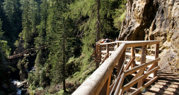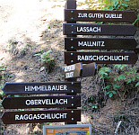 Nach dem Ausstieg geht der Weg weiter Richtung Gasthaus "Zur guten Quelle" . Die Gehzeit vom Ausstieg bis zum Gasthaus beträgt ca. 40 min. Hier besteht die Möglichkeit mit dem Wanderbus wieder nach Oberfellach zurückzufahren. Insgesamt ist von Obervellach bis zum Gasthaus mit einer Gehzeit von 2,5h zu rechnen. Alternativ kann man auch beim Schluchtausstieg über die Burg Groppenstein zurück zum Ausgangspunkt gelangen. Empfehlenswert ist jedoch den Weg weiter durch die Rabischschlucht nach Mallnitz zu nehmen. Vom Gasthaus "Zur guten Quelle" geht es nach dem Queren der Straße weiter nach Lassach-Schattseite und von dort dem Mallnitzbach entlang in die Rabischschlucht. Die Rabischschlucht weist eine Höhendifferenz von ca. 200m auf. Auf dem Weg durch die imposante Schlucht kommt man immer wieder zu Plattformen, auf denen man sich direkt über dem schäumenden Wasser bewegt. Der Weg verlässt die Schlucht direkt im Talboden von Mallnitz. Die Gehzeit vom Gashaus "Zur guten Quelle" bis Mallnitz beträgt ca. 2h. Insgesamt beträgt die Gehzeit von Obervellach-Räuflach über die Groppensteinschlucht und Rabischschlucht nach Mallnitz-Bahnhof ca. 5.5h bei einer Höhendifferenz von 540 m. |