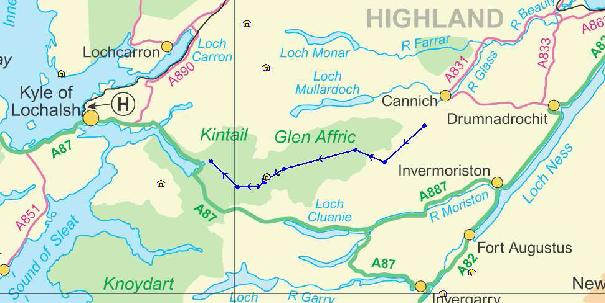 Der Glen Affric Trial kann in 2-3 Tagen gewandert werden. Die längere Variante startet in Tomich mit einer Übernachtung in der Nähe von Cougie. Kurzvariante beginnt am Loch Affric Parkplatz. Der Weg ist nicht markiert. Kenntnisse im Kartenlesen sind unerlässlich. Wegverlauf Tag 1: Drumnadrochit nach Cougie Tag 2: Cougie – Glen Affric Abstecher: Vom Glen Affric Youth Hostel können Über 20