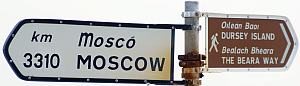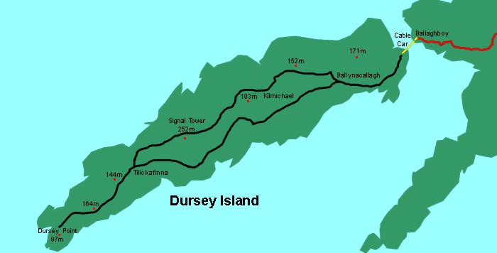 Auf der Insel folgt man den violetten Pfeilen entlang des Weges auf der südliche Seite der Insel. Dies ist zugleich die Weiterführung des Beara Weitwanderweges, der mit gelben Pfeilen markiert ist. Nach etwa 1 km erreicht man Ballynacallagh, den ersten der drei Orte auf der Insel. Der Weg führt 1 km weiter, bevor man Kilmichael erreicht. Hier befinden sich die Ruinen einer alten Kirche, die von den Mönchen von Skellig Michael gegründet worden sein soll. Man geht nun den Weg weitere 3 km. Während man auf der linken Seite den Blick auf die Beara Halbinsel genießt, befinden sich rechts eine Reihe steiler Hügel auf deren höchster Erhebung der Signalturm steht (252m), den man auf dem Rückweg besichtigt. 100 m nach dem Ende des Weges geht man entweder geradeaus weiter zum Dursey Head, dem westlichsten Punkt der Insel, oder man biegt scharf rechts ab, um zum Signalturm aufzusteigen. Der Abstecher zum Dursey Head dauert hin und zurück etwa eine Stunde. Man folgt nun den violetten und gelben Pfeilen auf einem gut ausgetretenen Pfad ca. 15 min bis zu den Ruinen des Signalturms. Hier hat man einen herrlichen Ausblick auf die Nordseite der Insel und die Küste von West Cork. Die zwei markanten Inseln in der Nähe heißen Bull und Cow. Vom Turm aus führt der Weg abwärts auf einen Sattel, bevor der "grüne " Weg scharf nach links abbiegt und wieder kurz aufwärts führt.