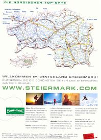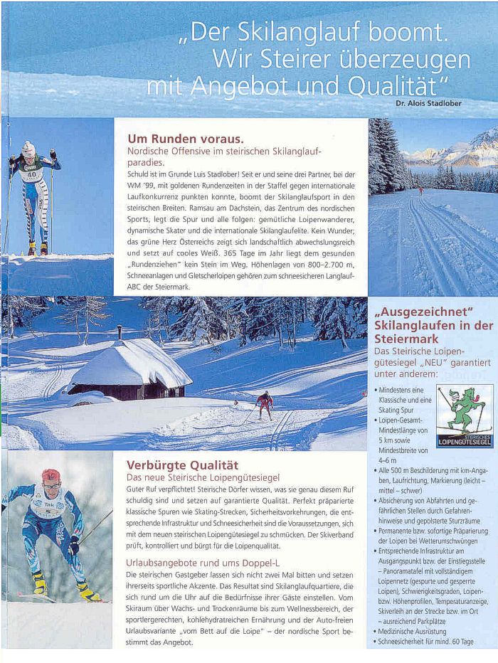 Winterliches Weiß am Dachstein Gletscher in 2.700 m SH - die Langlauf Weltelite trainiert schon seit Sommerende auf den perfekt gespurten Gletscherloipen am Schladminger-und Hallstätter Gletscher. Herbstliche Farben dominieren im Süden und Osten der Steiermark rund um heißen Quellen der Thermen. Der neue Wein, der steirische Junker wurde schon präsentiert und in den Buschenschänken herrscht Hochbetrieb. Das steirische Gütesiegel Guter Ruf verpflichtet! Steirische Dörfer wissen, was sie genau diesem Ruf schuldig sind und setzen auf garantierte Qualität. Perfekt präparierte klassische Spuren wie Skating-Strecken, Sicherheitsvorkehrungen, die entsprechende Infrastruktur und Schneesicherheit sind die Voraussetzungen, sich mit dem neuen steirischen Loipengütesiegel zu schmücken. Der Skiverband prüft, kontrolliert und bürgt für Loipenqualität. In der Steiermark hat man vor Jahren ein Loipen Gütesiegel entwickelt, jährlich geprüft und die Top Langlauforte - 7 Destinationen - haben sich zu einer Arbeitsgemeinschaft zusammengeschlossen. Top Qualtität im Bereich der Loipen Infrastruktur und attraktive Langlauf Packages sind die Basis für die Langlauf Orte der Steiermark. Im Nordic Folder sind 23 Betriebe mit direkt buchbaren Angeboten übersichtliche präsentiert. Die Langlauf Destinationen der Steiermark sind: Ramsau am Dachstein, das Salzkammergut Steiermark mit Bad Mitterndorf, Tauplitz-und Tauplitz Alm, Bad Aussee, Grundlsee und Altaussee, Liezen, Hall bei Admont, Eisenerz, St.Jakob und die Hebalm. Guter Ruf verpflichtet. Die steirischen Langlauf Dörfer setzen auf garantierte Qualität und nützen die landschaftlichen Vorteile. Der Dachstein Gletscher und die Tauplitz Alm mit ihren Höhenloipen sind international bestens bekannt. In der Ramsau und Bad Mitterndorf kann man tatsächlich "vom Bett auf die Loipe", denn die meisten Langlaufbetriebe sind unmittelbar an den Loipen gelegen. Und - die steirischen Loipendestinationen setzen auch auf Sportlichkeit - und "Skaten" ist IN! Das "Skating" und die klassische Variante des Skilanglaufs gehören zu den effektivsten und gelenkschonensten "Gesundsheitssportarten" (Zitat: Stefan Schwarzbach - Aktiv Sportmagazin). Und alle Nordic Walking Freaks haben bereits die besten Voraussetzungen für den Einstieg in die klassische Langlauf Technik. Während die "Inline Skater" auch ohne große Schnee-Erfahrung schon zu den "fortgeschrittenen" zählen bei den Winter Skatern. Denn wer mit Inline Skates halbwegs sicher unterwegs ist, verfügt bereits über die nötige Ausdauern-und Gleichgewichtsfähigkeit u. hat gelernt, sich "gleitenden Schrittes" fortzubewegen. (Zitat: Peter Schlickenrieder, Vize-Olympiasieger im LL-Sprint). Langlaufland Steiermark ist in München am Brunnplatz vertreten u. Weltmeister Alois Stadlober ist am Samstag persönlich mit Tipps u. Rat auf der Loipe anwesend. Bestellen Sie den aktuellen Prospekt "NORDIC Skilanglauf - Steiermark 2003 / 2004" bei: Steirische Tourismus GmbH |